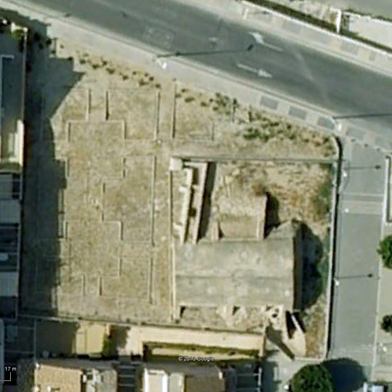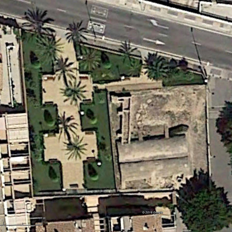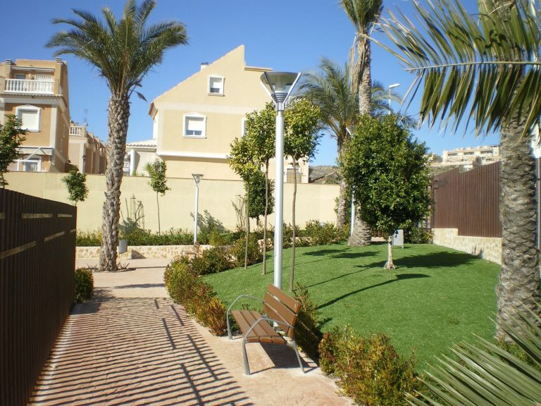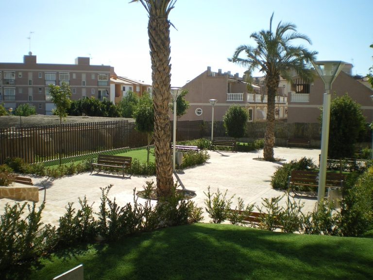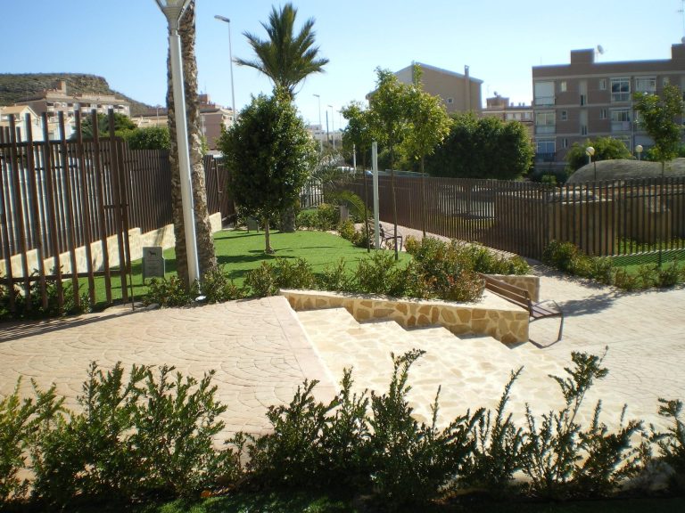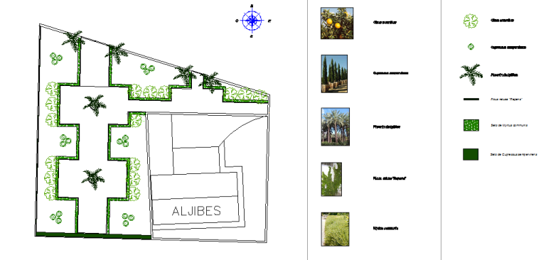 Se trazaron parterres geométricos, bordeados con setos de mirto. Se eligieron especies endémicas o adaptadas a la zona, como la palmera datilera o el naranjo amargo para conformar la estructura vegetal. Se proyectaron cipreses de gran envergadura, pero hubo que sustituirlos debido a la alergia de una vecina. Se plantaron Ficus nitida de corte cilíndrico en su lugar, aunque con el tiempo, algún responsable de mantenimiento les ha dado porte cónico.