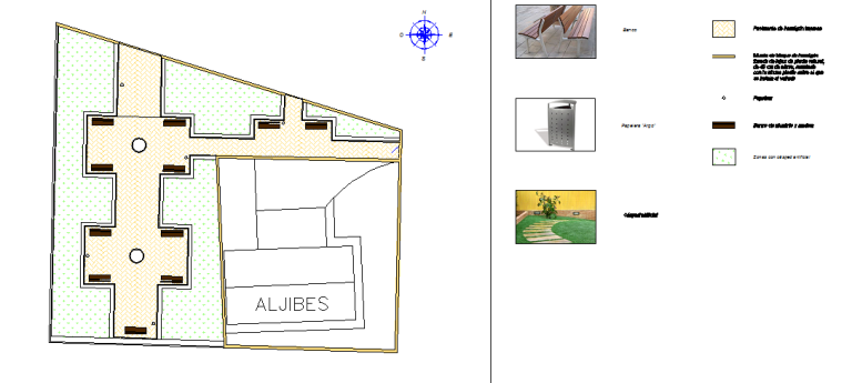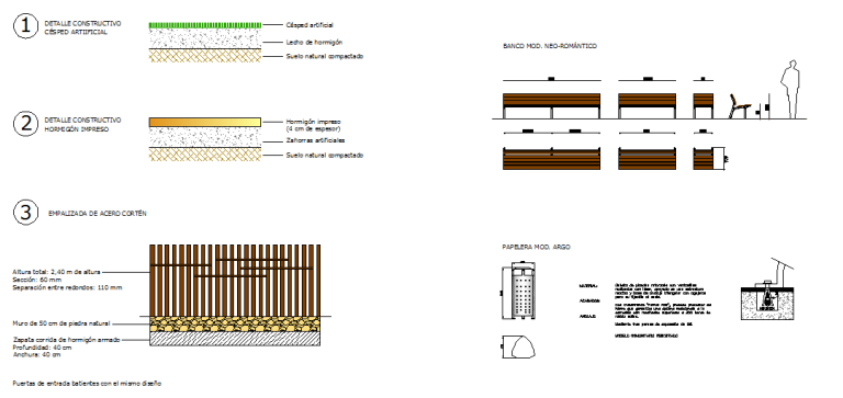 La colocación de mobiliario cumplió también con el patrón del jardín formal, ocupando los bancos y las papeleras lugares simétricos en la zona principal del parque.