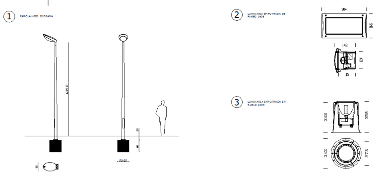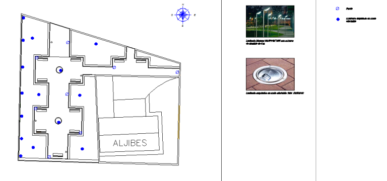 La iluminación se pensó para cumplir dos funciones: cubrir el espacio de noche para que hubiese seguridad (farolas) y realzar algunos puntos de especial interés (focos empotrados en el suelo).