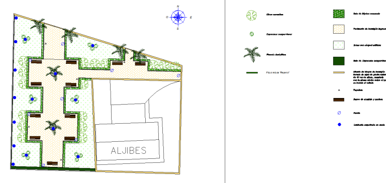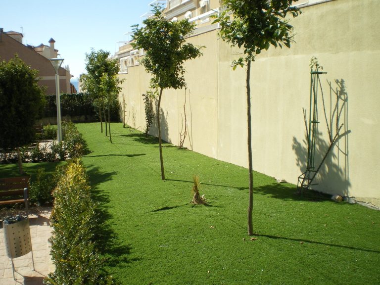 Dado el alto grado de utilización esperado y la necesidad de tener un mantenimiento controlado, se instaló césped artificial en el interior de los parterres. El césped natural habría sido inviable, ya que las superficies segables habrían sido poco prácticas. El resultado fue una sensación verde inmejorable que transformó por completo aquella zona residual que eran los aljibes del Massapá.