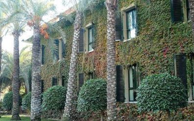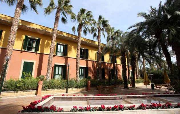 El Hotel se construyó en terrenos que tenían la estructura típica de los huertos de palmeras de Elche. En estos, la palmeras datileras se plantaban alineadas formando cuadrículas, en el interior de las cuales se plantaban otras especies que podían crecer mejor con la ayuda del microclima y la sombra creada por las palmáceas. Desde que el Patronato del Palmeral de Elche gestiona este patrimonio, no se puede eliminar ni trasplantar ningún ejemplar sin la supervisión de éste. En este caso, así hubo que proceder también.