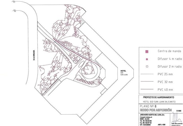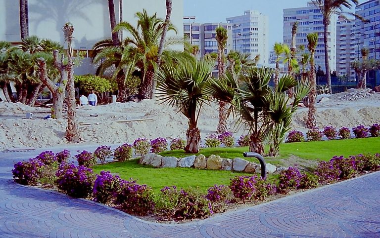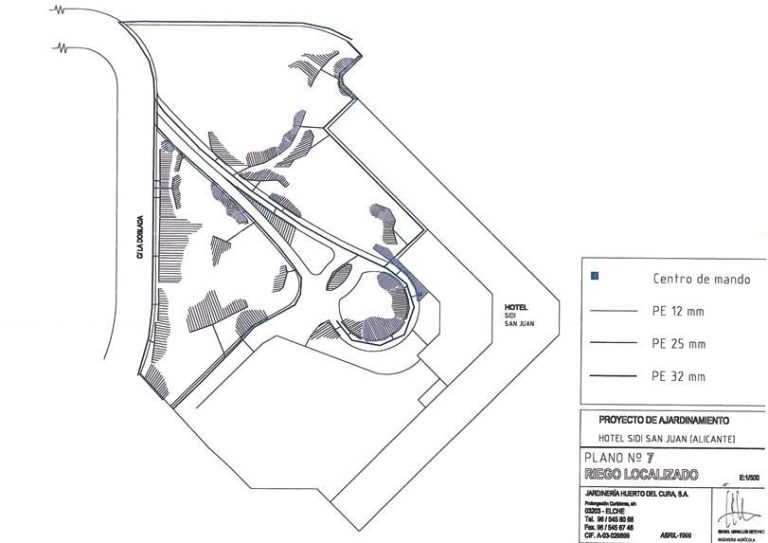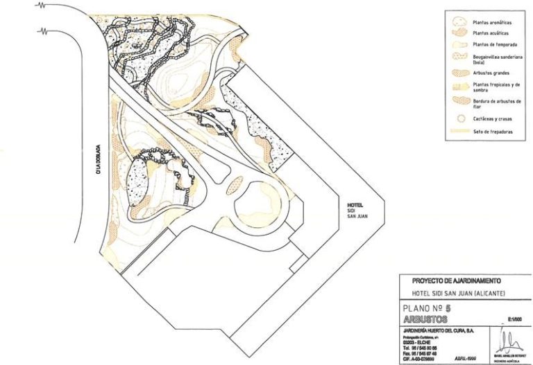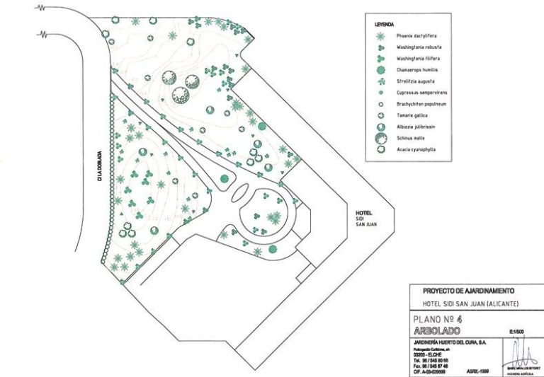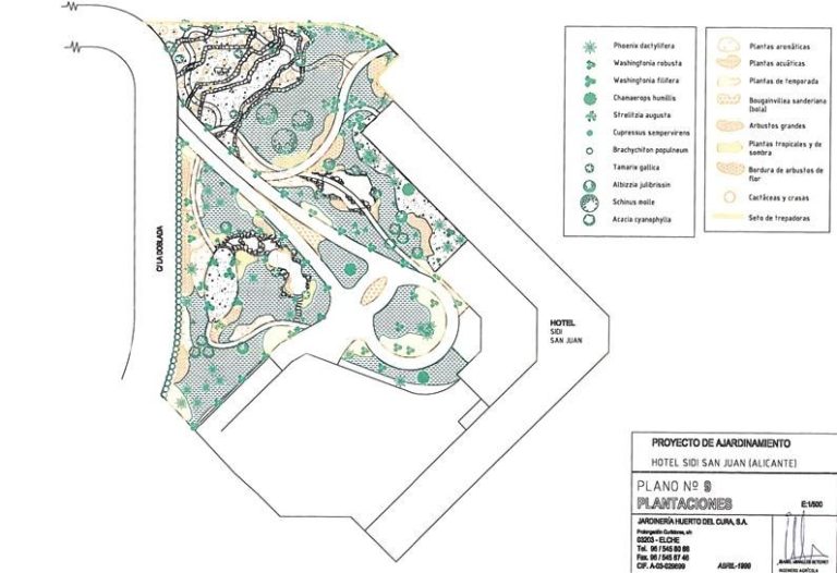Se trataba de una planta que se encontraba en principio disgregada en numerosos espacios. Por un lado, existía una “cara” del hotel al mar, que tenía una jardinería en terrazas, en la que dominaban las palmeras de gran altura. Por otro lado, la zona objeto del proyecto de ajardinamiento tenía forma irregular, con vertido de aguas hacia la puerta principal del hotel. La zona a ajardinar cubría una superficie aproximada de 3.500 m2.