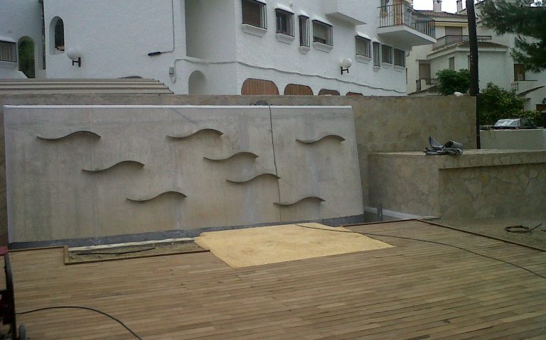La fuente, diseñada como una pared inclinada muy pulida por la que se deslizaba una manta de agua que caía sobre varios obstáculos (láminas de acero incrustadas sobre la pared, con forma de peces), se iluminó con leds. Se consiguió un juego de agua mediante los volúmenes, el brillo del acero, la espuma, el sonido y la luz.