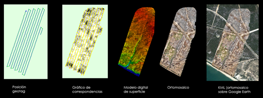 - misión programada: bandas de cobertura ortogonal sobre la superficie de estudio con cámara multiespectral, termográfica y RGB